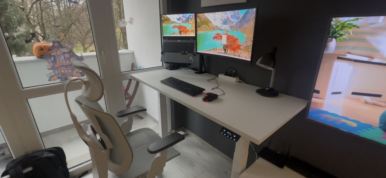 Biroul nu se balansează, blatul biroului își păstrează forma chiar și în cea mai înaltă poziție. Puteți pune până la 150 kg pe o parte a mesei și aceasta va fi în continuare dreaptă. Așa că nu trebuie să vă faceți griji că veți cădea cu masa.