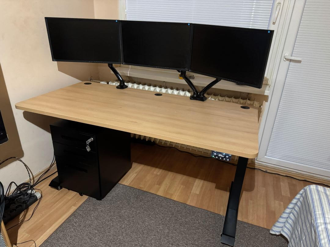 A fost nevoie de aproximativ o jumătate de zi (aproximativ 6-8 ore) pentru a asambla masa, de la despachetarea acesteia, la asamblarea picioarelor, calcularea suportului pentru cablu, centrarea picioarelor pe blatul mesei cu o precizie de câteva zecimi de milimetru (nu vreau ca masa să fie strâmbă), până la fixarea finală a totul pe blatul mesei cu o șurubelniță, la montarea acesteia, echilibrarea mesei și testarea acesteia. În cele din urmă, totul a funcționat de la prima încercare. Masa chiar își amintește să așeze totul atunci când este deconectată - mașinile de spălat rufe și vasele ar putea să se inspire! :-)