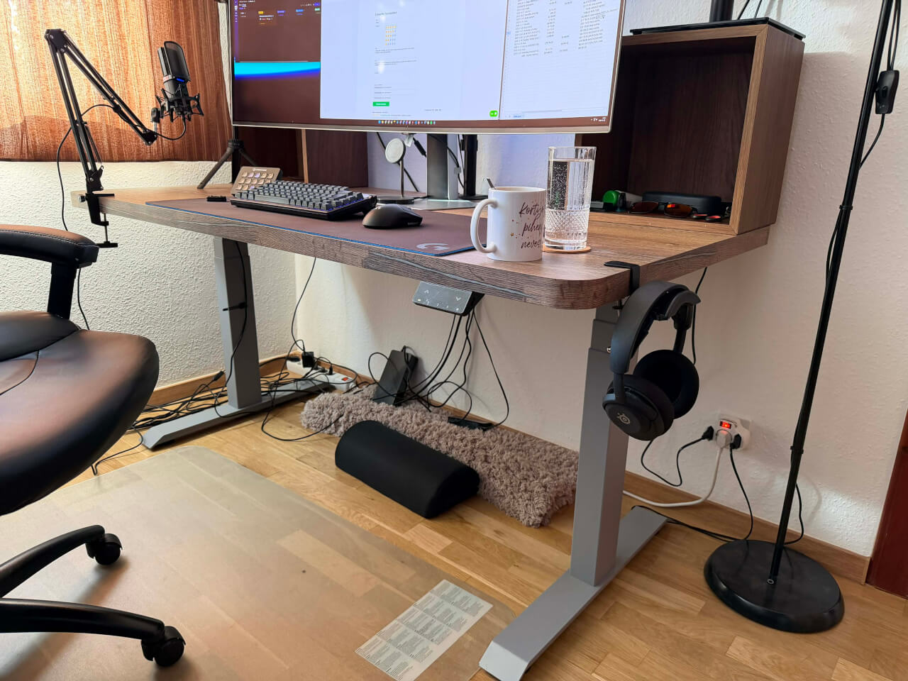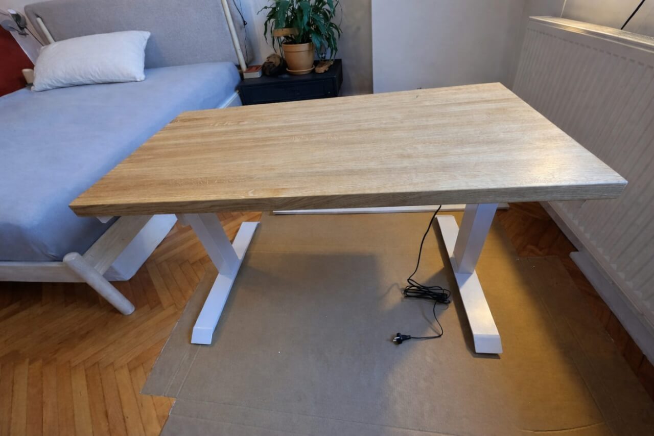 A fost nevoie de aproximativ o jumătate de zi (aproximativ 6-8 ore) pentru a asambla masa, de la despachetarea acesteia, la asamblarea picioarelor, calcularea suportului pentru cablu, centrarea picioarelor pe blatul mesei cu o precizie de câteva zecimi de milimetru (nu vreau ca masa să fie strâmbă), până la fixarea finală a totul pe blatul mesei cu o șurubelniță, la montarea acesteia, echilibrarea mesei și testarea acesteia. În cele din urmă, totul a funcționat de la prima încercare. Masa chiar își amintește să așeze totul atunci când este deconectată - mașinile de spălat rufe și vasele ar putea să se inspire! :-)