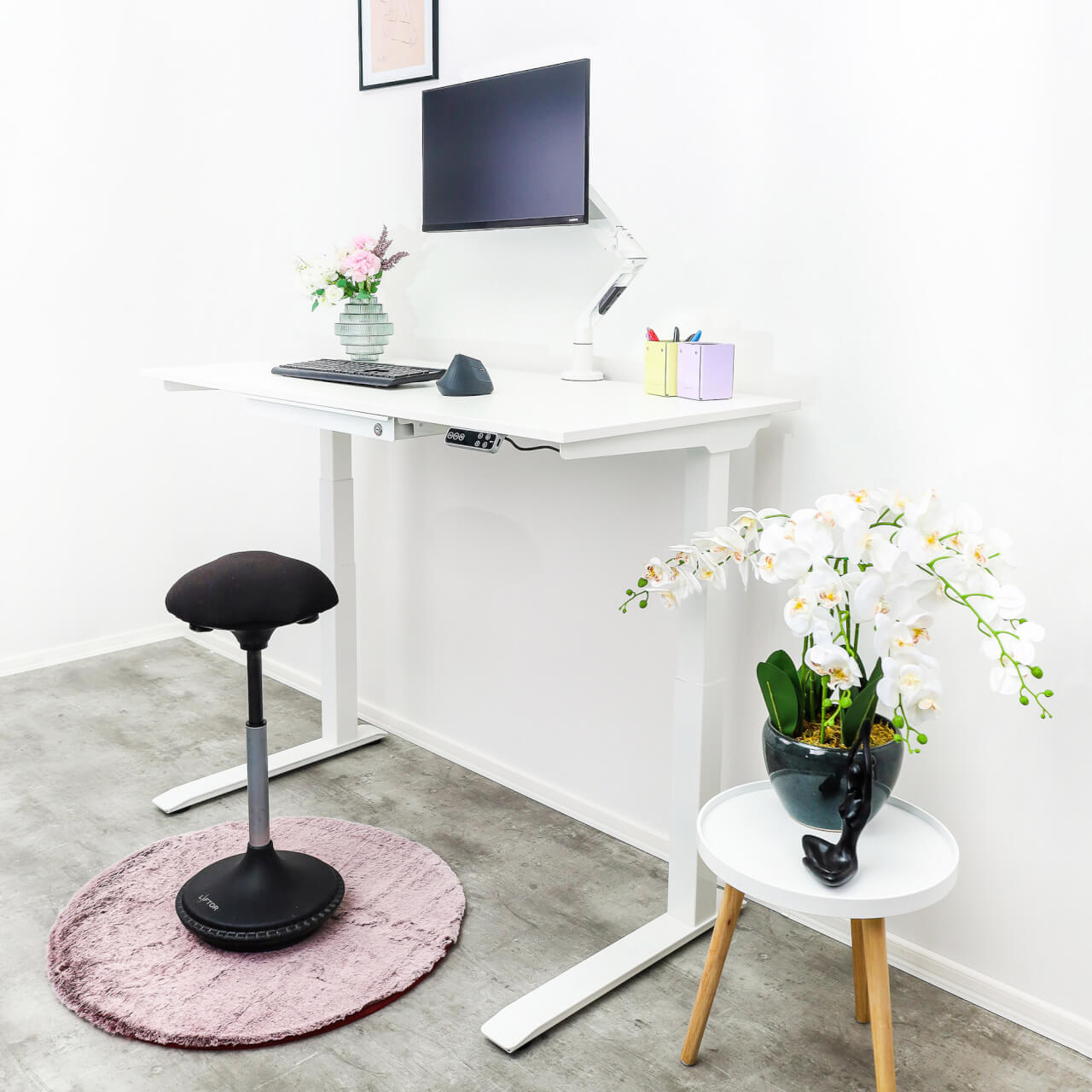 Biroul nu se balansează, blatul biroului își păstrează forma chiar și în cea mai înaltă poziție. Puteți pune până la 120 kg pe o parte a mesei și aceasta va fi în continuare dreaptă. Așa că nu trebuie să vă faceți griji că veți zbura în aer cu aceasta ca un steag pe un catarg.